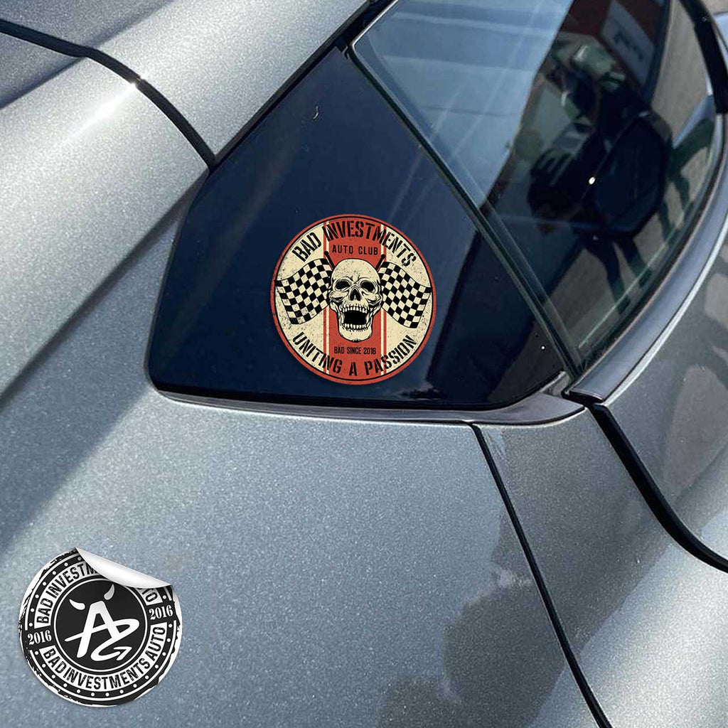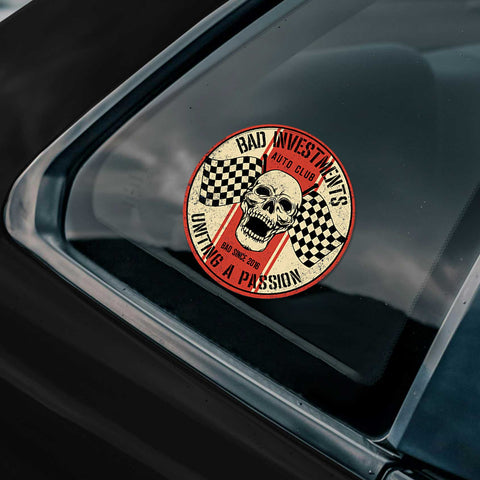 Get your ride noticed with the Bad Investment Auto Racing Skull Drift Sticker, an aggressive vinyl graphic that combines skull imagery with racing vibe energy. Made from weather-resistant outdoor vinyl, this decal brings attitude to cars, trucks, SUVs, or gear while lasting through sun, rain, and daily driving. To maximize the vinyl's lifespan and durability, follow our decal application instructions.
