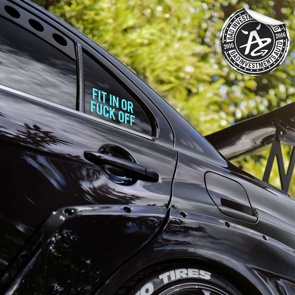 Say exactly what you mean with the Fit In or Fuck Off Vehicle Decal. Designed for drivers who refuse to blend in, this bold vinyl decal delivers raw attitude with zero filter. Made from durable outdoor vinyl, it’s built to handle daily driving, weather, and unwanted opinions. To maximize the vinyl's lifespan and durability, follow our decal application instructions.