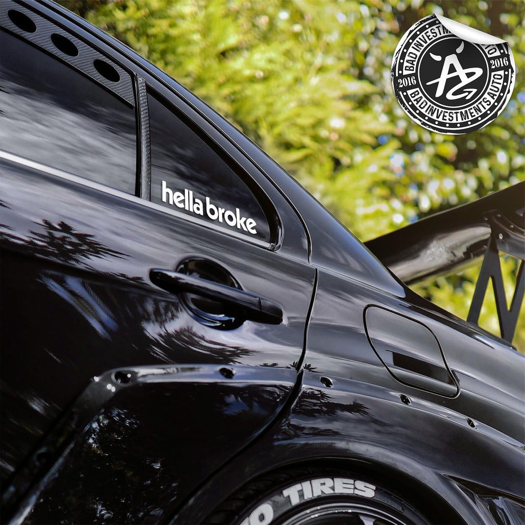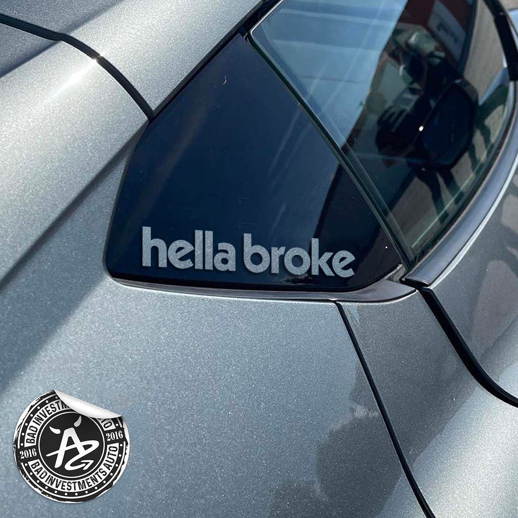 Show off your sense of humor with the Hella Broke Funny Car Decal, a weatherproof vinyl sticker designed to bring fun and character to your ride without compromising durability. Perfect for cars, trucks, SUVs, and beyond. To maximize the vinyl's lifespan and durability, follow our decal application instructions.