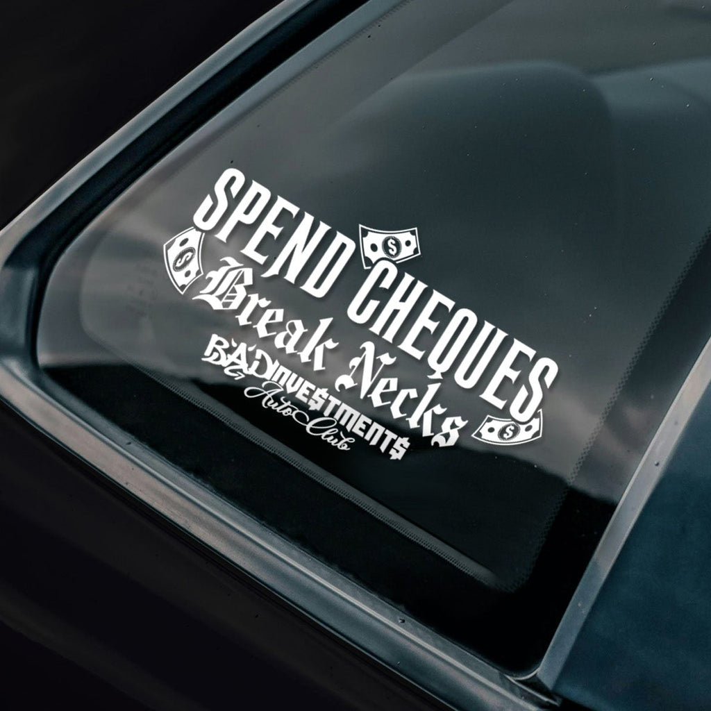 Make a statement that turns heads while supporting the club with the Spend Cheques 2.0 Banner Decal. Whether cruising to meets or running errands, this banner decal brings a playful message and lasting outdoor performance. To maximize the vinyl's lifespan and durability, follow our decal application instructions.